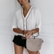 This blouse features a classic yet stylish white tone,the v-neck and hollow out details can help exude your sexy and feminine appeal,while its soft fabric and loose silhouette design will promise you a comfortable day. Perfect fit for matching with different style bottoms like shorts,skirts,jeans and so on.