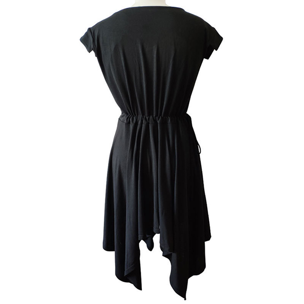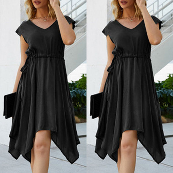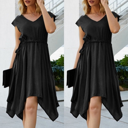 Create a sassy look with the help of this dress. Solid color style,finished with cap sleeve,v-neck and an irregular hem,this dress definitely can offer you a cozy yet stylish style. No matter for your busy workdays or weekend out,this versatile dress can be a wise choice.