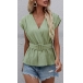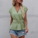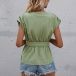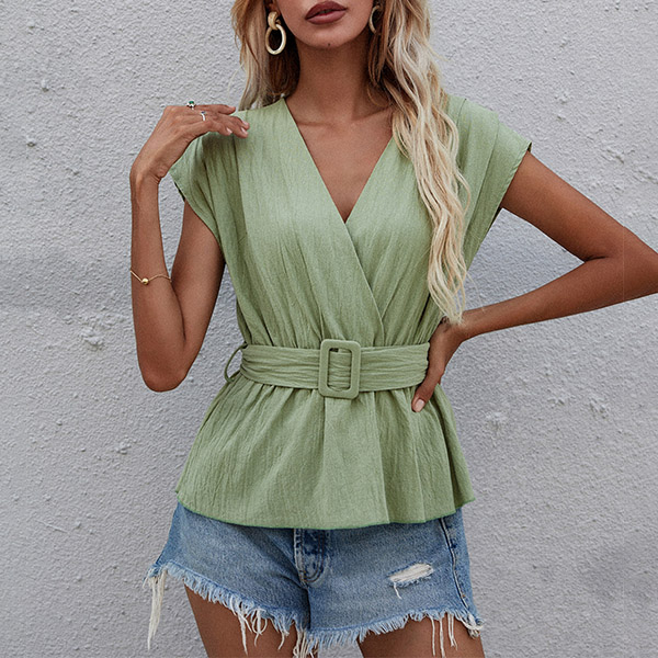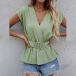 Fashion Solid Color Cap Sleeve V-neck Top with Waistband