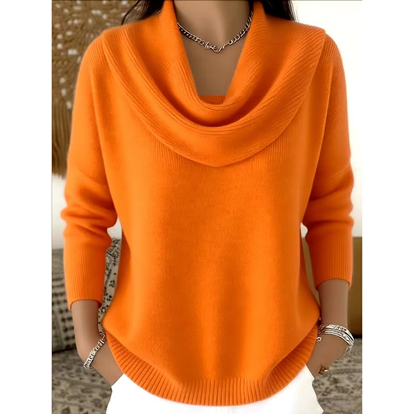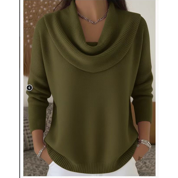 Denna eleganta tröja har en sofistikerad draperad halsringning, bekväm långärmad modell och en enfärgad, mångsidig stil för modern och raffinerad komfort. Finns i flera färger.