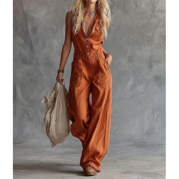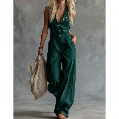 Denna jumpsuit har en modern, moderiktig stil med funktionella knappar framtill och en praktisk utility-design som ger samtida och mångsidig sofistikering. Den vida benkonstruktionen ger bekväm rörelse med böljande elegans, medan utilitystilen erbjuder praktisk funktionalitet och modern charm. Hoppas du gillar den.