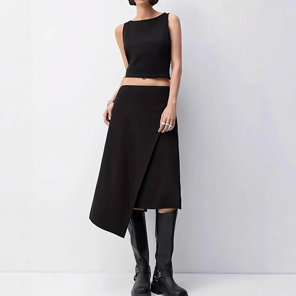 Upplev modern minimalism i världsklass med denna sofistikerade kjol. Den höga midjan framhäver figuren och skapar en smickrande silhuett, medan den unika oregelbundna fållen ger konstnärlig asymmetri och livfull rörelse. Diskret sidoslits tillför en sexig, avslappnad detalj som låter benen synas vackert vid varje steg – utan att kompromissa med täckningen. Tillverkad i stretchigt, lättskött material som behåller formen och komforten hela dagen. Perfekt för eleganta vardags- eller kontorsprylar där du vill sticka ut, få komplimanger och känna dig självsäker med en trendig, funktionell design.