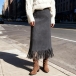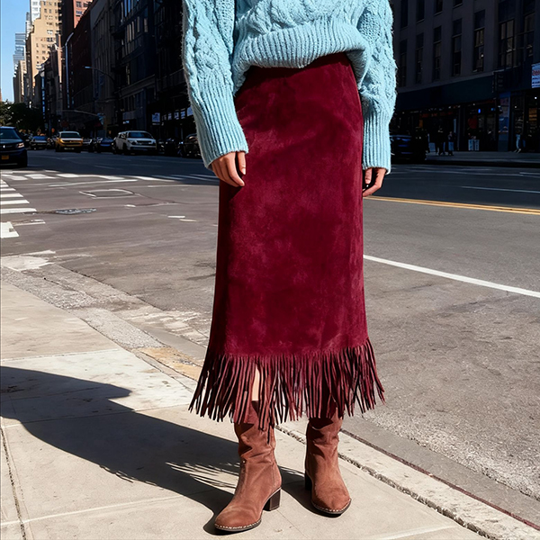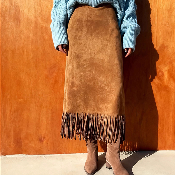 Upplev en ny nivå av femininitet med vår lyxiga mockakjol. Den klassiskt A-formade siluetten framhäver midjan och erbjuder en smickrande passform som skiljer sig från vanliga stretchkjolar på marknaden. Det högkvalitativa mockamaterialet bjuder på djup, taktil textur och en sammetslen finish som förvandlar vardagslooken till något alldeles extra. Lekfulla tofsdetaljer i fållen skapar rörlig elegans och bryter upp den strukturerade linjen med subtil charm. En mångsidig bas i garderoben – perfektion med boots och stickad tröja för en avslappnad dag eller med blus och pumps för en chic kvällsstil. Höj din garderob med en kjol som kombinerar exklusiv kvalitet, modern design och tidlös elegans.