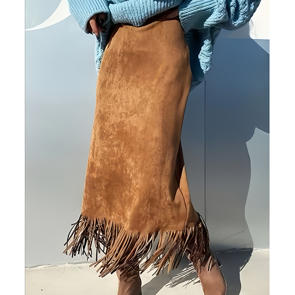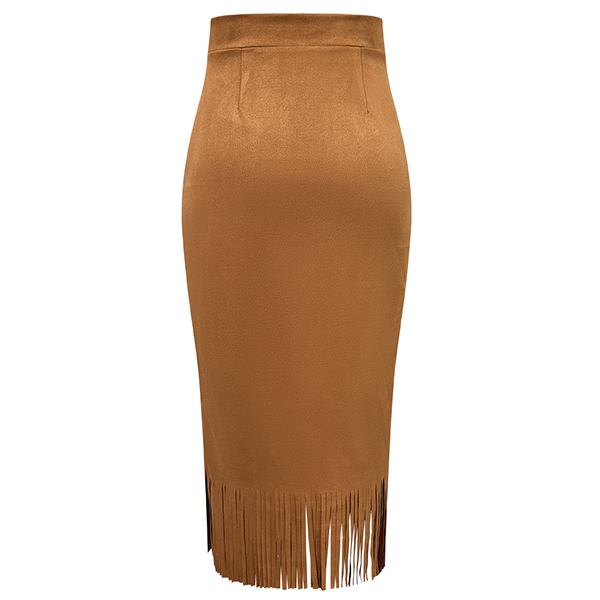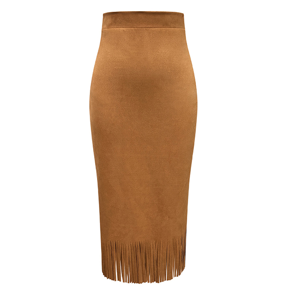 Pennkjol i mocka med hög midja och tofsdetaljer, enfärgad och trendriktig