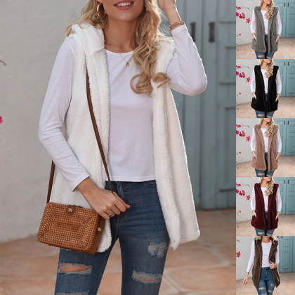 För dessa varken för varma dagar eller för kalla dagar kan den här västen vara ditt bra val. Enfärgad stil, avslutad med ärmlös siluett med huva och dragkedja fram, enkel men klassisk. Dess mjuka plyschtyg kan ge dig en varm dag. Du kan matcha den med t-shirts, tröjor, skjortor och så vidare.