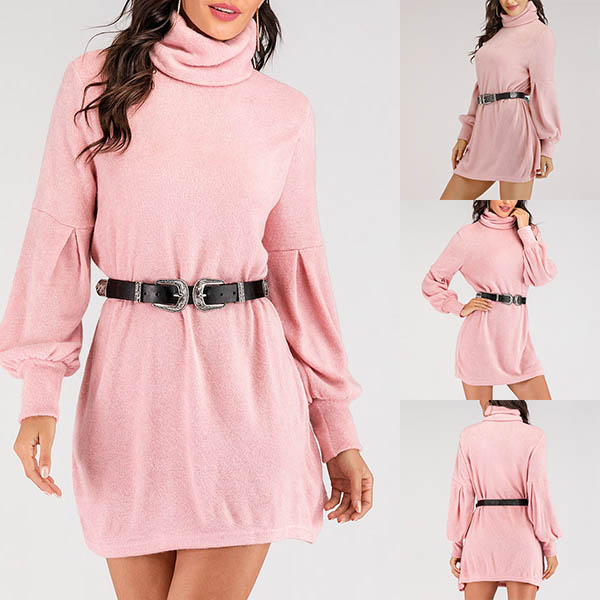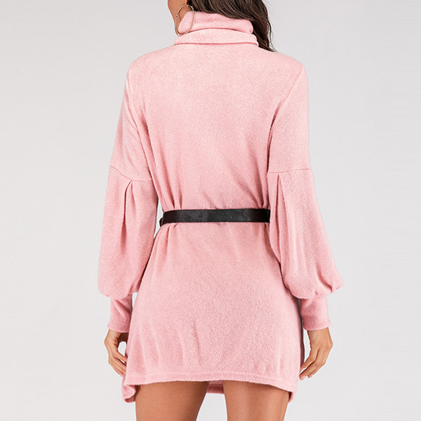Fashion Solid Color Lantern Sleeve Turtleneck Knit Dress(Without belt)