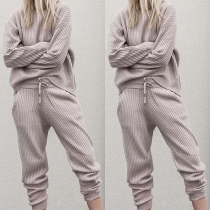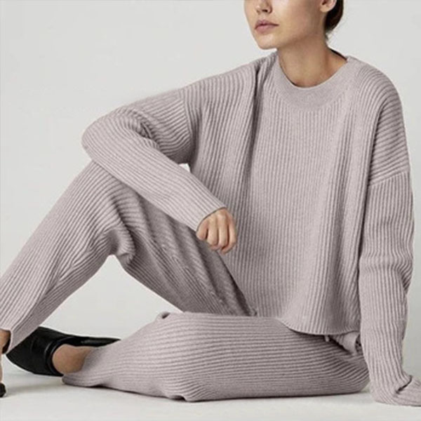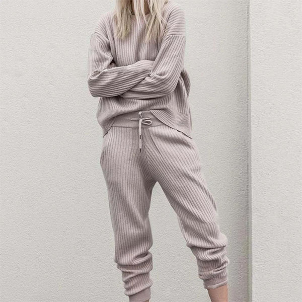Fashion Solid Color Long Sleeve Knit Top + Pants Two-piece Set