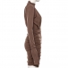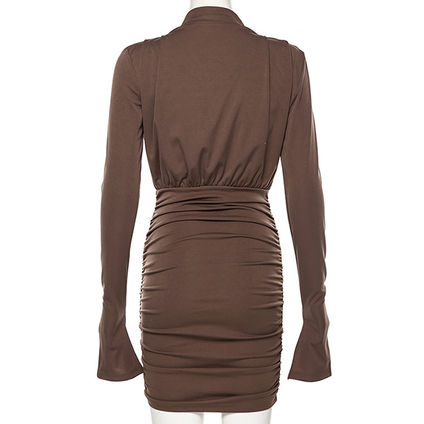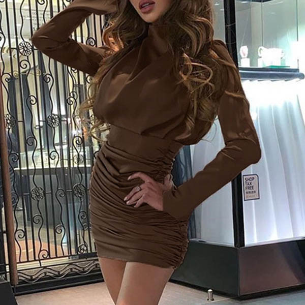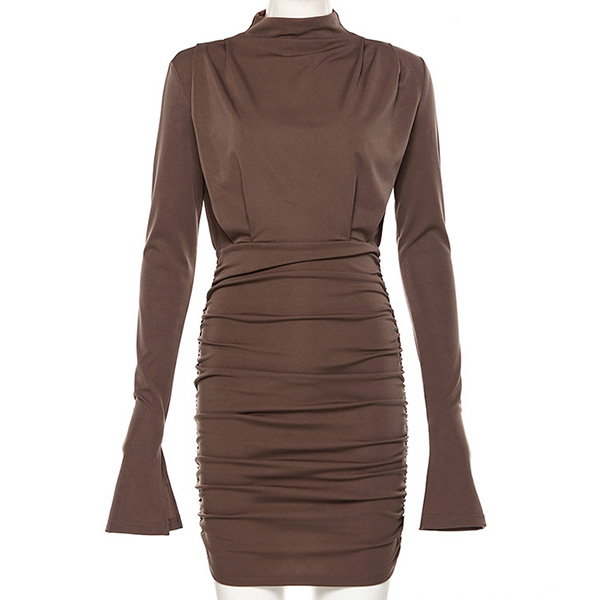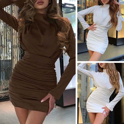 Fashion Solid Color Long Sleeve Mock Neck Slim Fit Wrinkled Dress