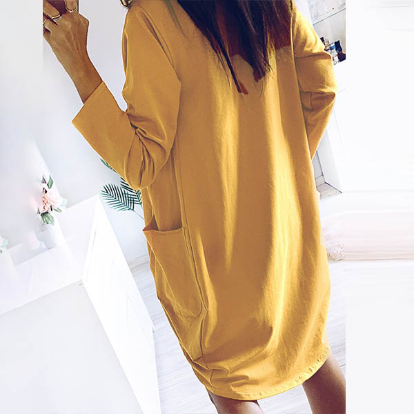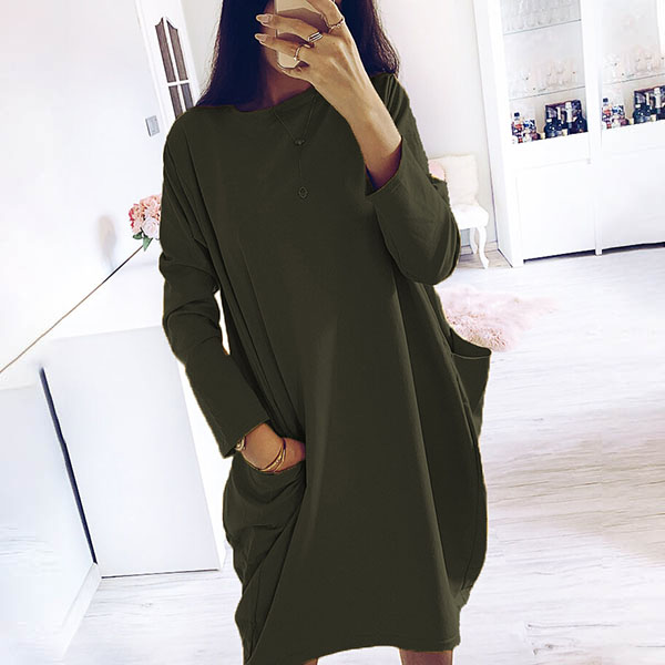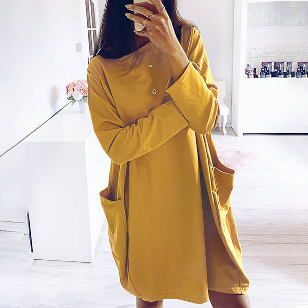 Fashion Solid Color Long Sleeve Round Neck Front-pocket Loose Dress
