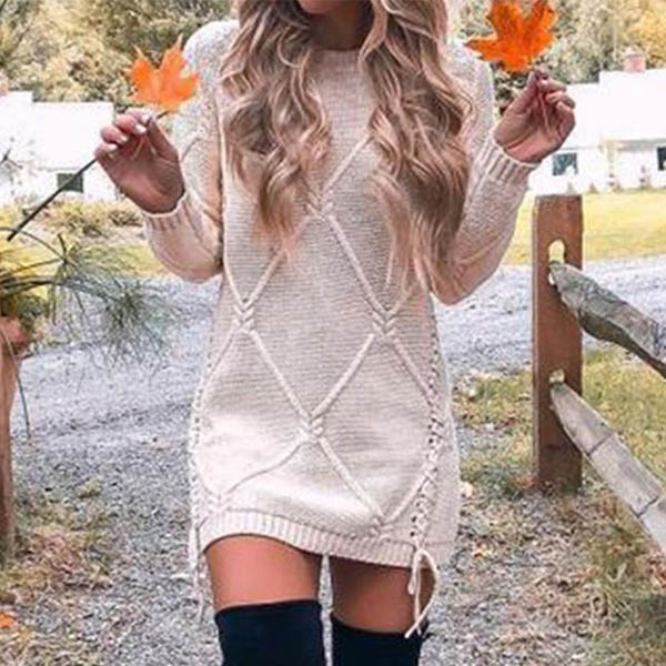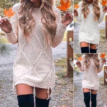 This sweater dress is worth to be your new darling when the days get cold. Solid color style,finished with long sleeve,round neck and a clean silhouette,simple,cozy yet stylish. What makes this piece look so attractive is because of the side lace-up details. You can match with your over-the-knee boots to have a beautiful and charming look!