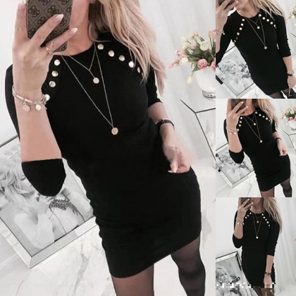 Thanks to the flattering black tone and fit silhouette design,your slender figure can have a full display in this dress. Finished with long sleeve and round neck design,the button details will make this piece look more attractive. This is a dress which can fit for different occasions. So why not invite it to your wardrobe?
