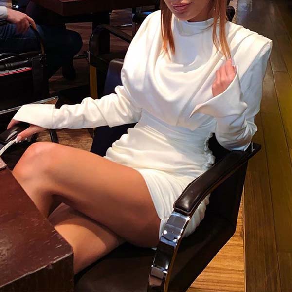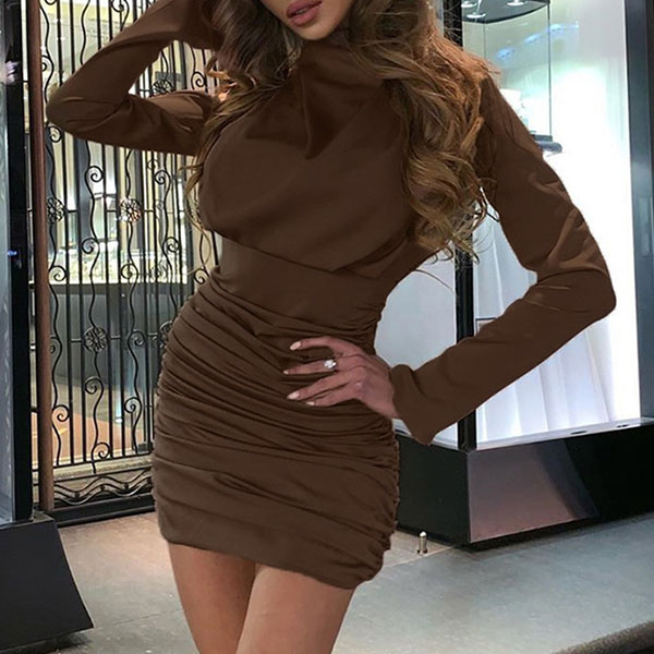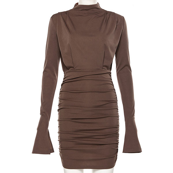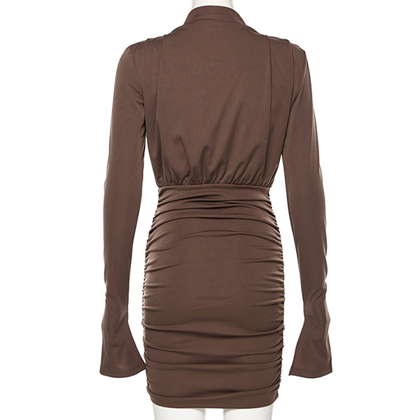 Fashion Solid Color Long Sleeve Slim Fit Wrinkled Dress