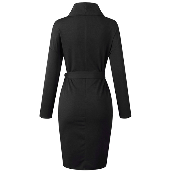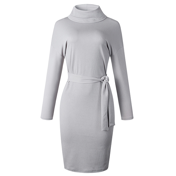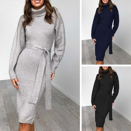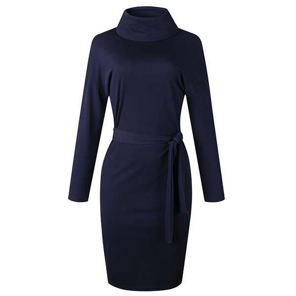 Fashion Solid Color Long Sleeve Turtleneck Dress with Waist Strap