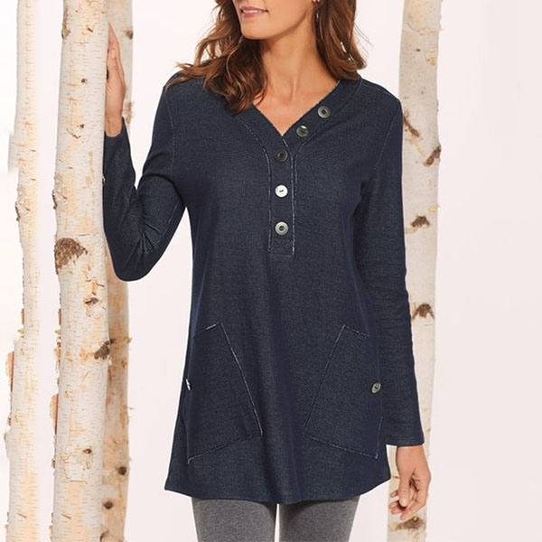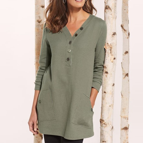 Fashion Solid Color Long Sleeve V-neck Front-pocket T-shirt