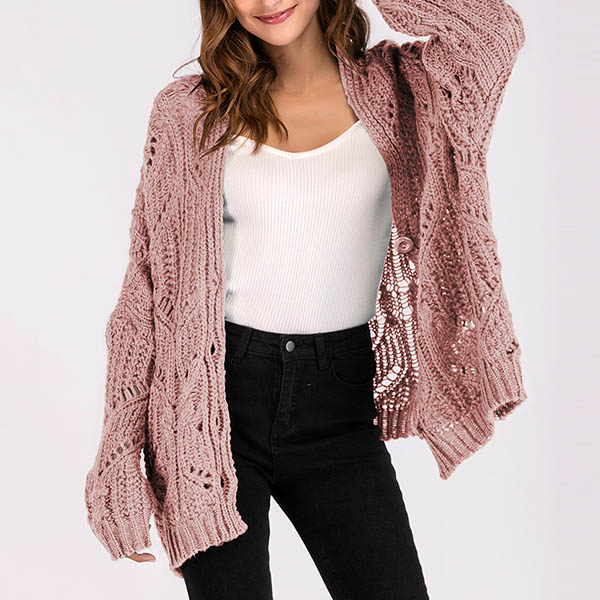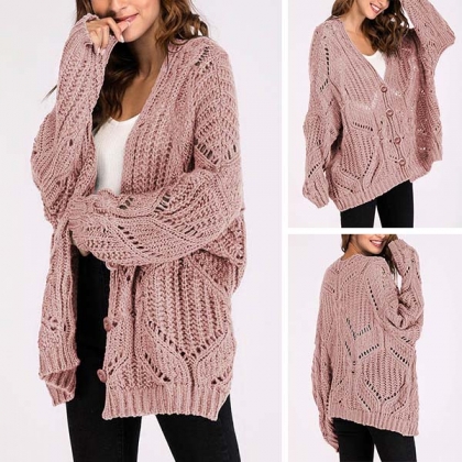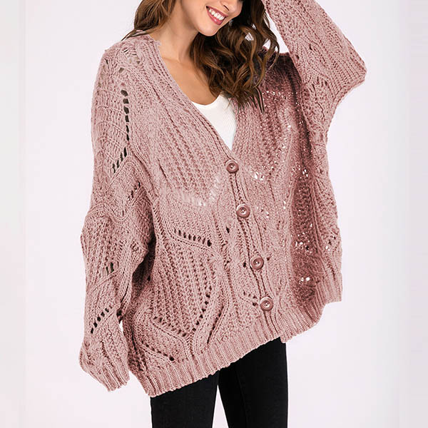 For these autumn days,this knit cardigan can easily strike your mind. Comes with a sweet pink tone,with long sleeve,v-neck and a loose silhouette,this piece can keep you warm and comfy all day. What's more,the hollow out details will make this piece look more attractive. You can count on this piece to achieve for a stylish autumn style.