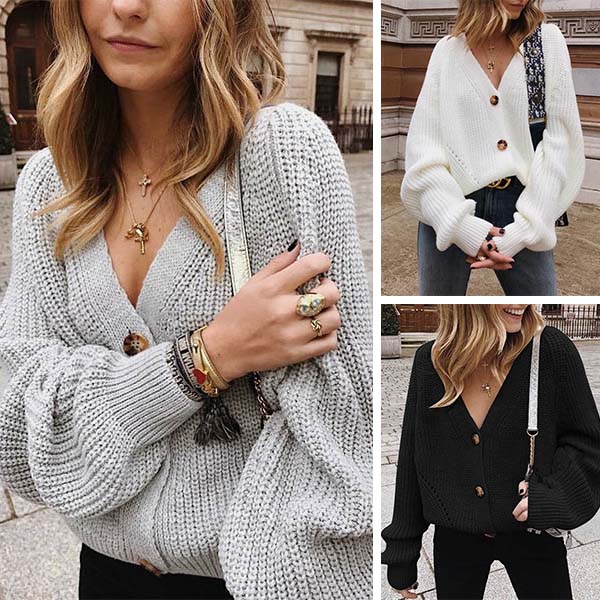 When the days get a little cold,this knit cardigan is worth to be your wardrobe staple. Boasts a solid color,finished with long sleeve,v-neck and a loose silhouette,this piece not only can offer you the comfy and warmth,but also can be matched with different style outfits.