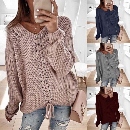Attracted by this chic and unique sweater? Then invite it to your wardrobe. Solid color style,with long sleeve,v-neck and a loose silhouette,this piece can keep you warm yet stylish. Then what makes this piece look so attractive? It owes to the lace-up details at the front side. If you like this style,then seize this chance.