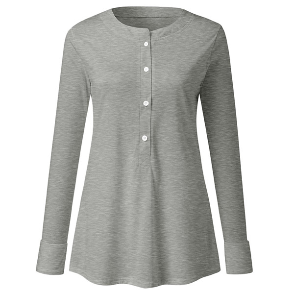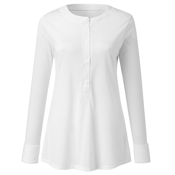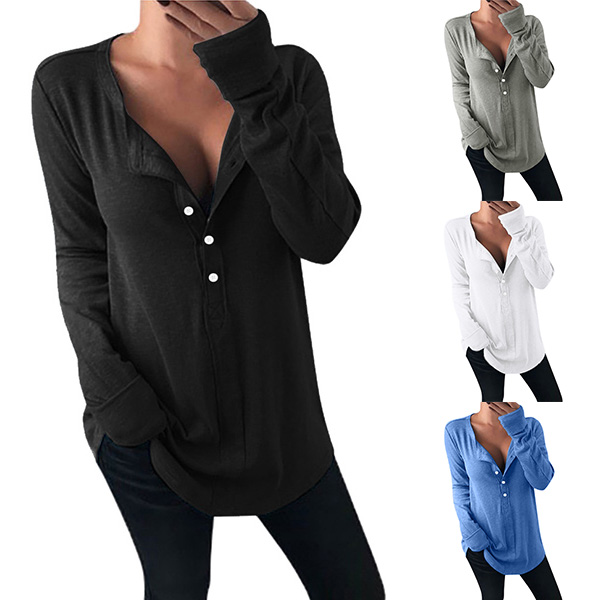 When it comes to a simple,casual and relaxed weekend style,you can have a try this t-shirt. It comes with a solid color,finished with long sleeve,v-neck and a loose silhouette,its soft and breathable fabric can ensure you a comfortable day. Neckline part with button design will boost its entire charm. Enrich your casual wardrobe ensemble with this little piece.