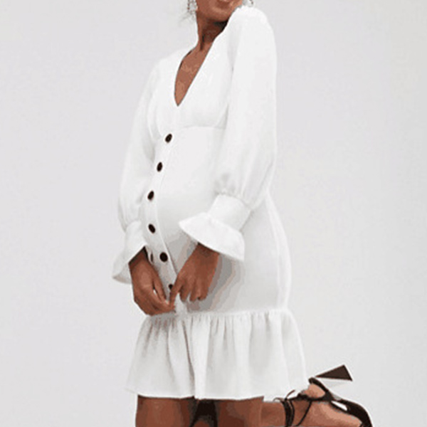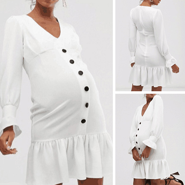 For these pregnant women,this dress is a good chance for them to showcase their sexy yet feminine side. Solid color style,the v-neck and ruffle hem design will lend you a sexier look,and the black button details will make this piece look more attractive. Enjoy a wonderful pregnant time with this dress!