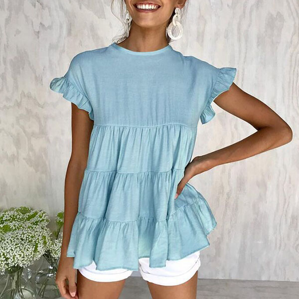 Crafted in a solid color,with lotus sleeve,round neck and a loose silhouette design,this piece not only can give you a comfortable day,but also knows how to exude your sweet and stylish vibes. Your perfect choice in these summer days.