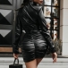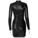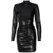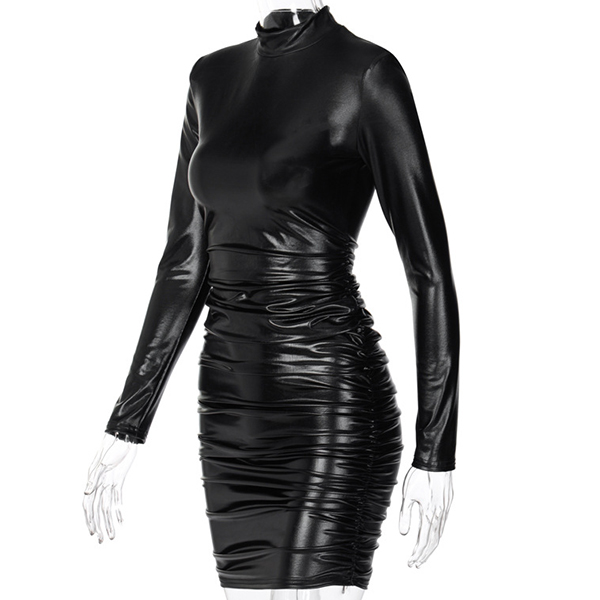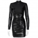 Mode enfärgad långärmad klänning i konstläder med ruched detaljer och hög hals