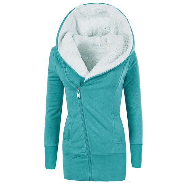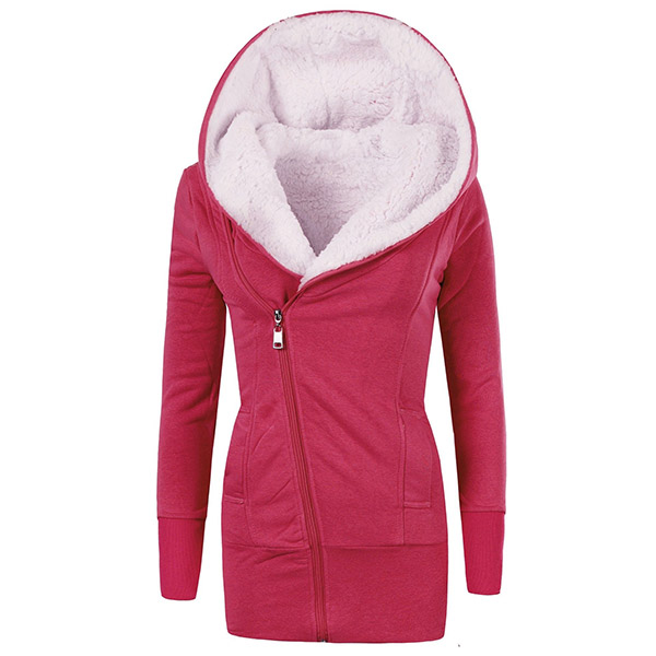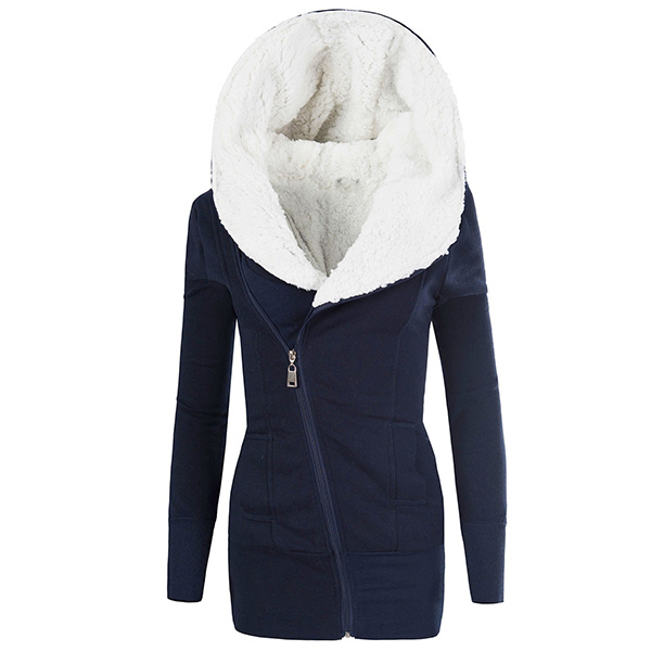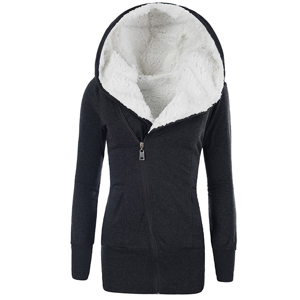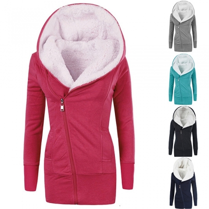 Hälsa de kalla dagarna med denna kappa. Den har en solid färg, den huvklädda siluetten och plyschfoderdesignen kan garantera dig en varm och bekväm dag. Dessutom gör den sneda blixtlåsdesignen att denna pjäs ser mer attraktiv ut. Det är ett klokt val att bjuda in den här kappan till din garderob i dessa kyliga dagar.