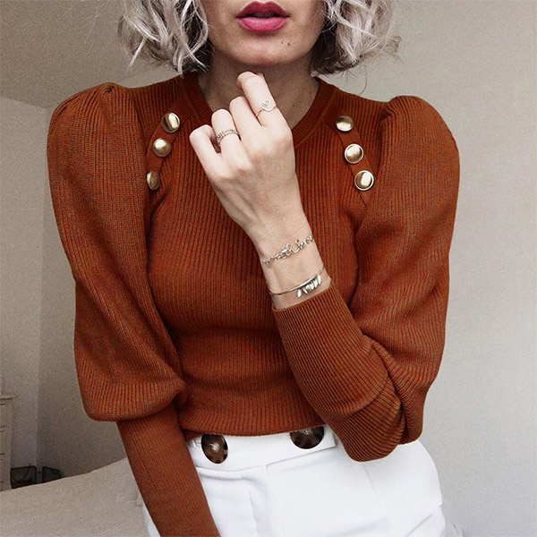 For these spring and autumn days,this knit top can be your wardrobe staple. It comes with a solid color,which makes it look simple,stylish yet generous. Moreover,the unique puff sleeve and button details will make it look more attractive. You can trust in this piece to stay warm while maintaining your style.