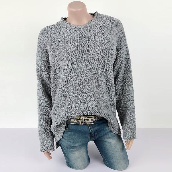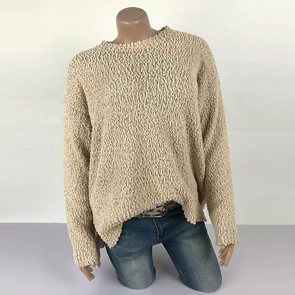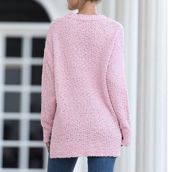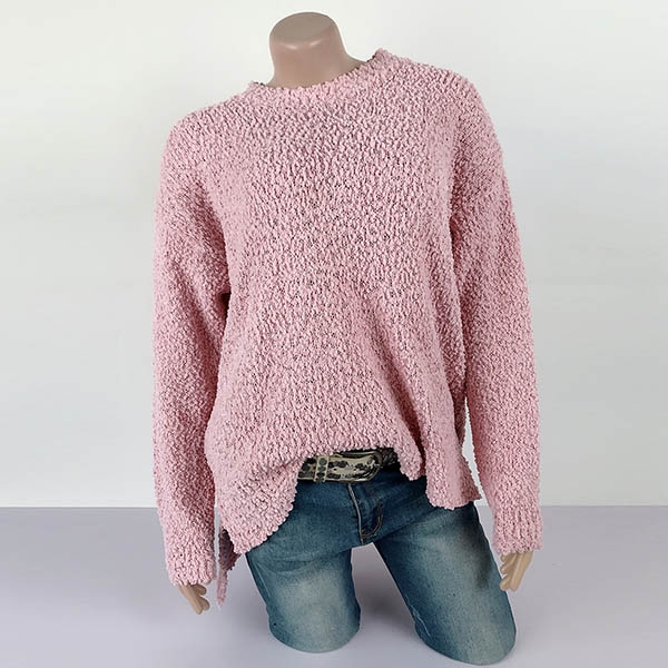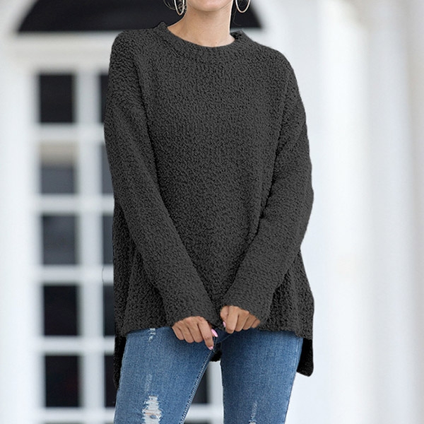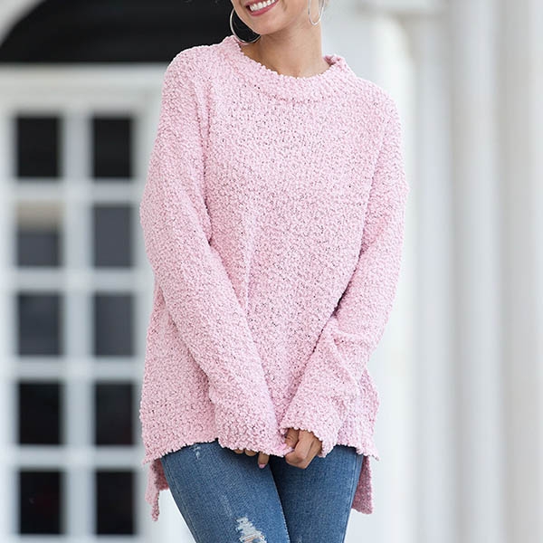 This sweater boasts a solid color,finished with long sleeve,round neck and slit hem design,