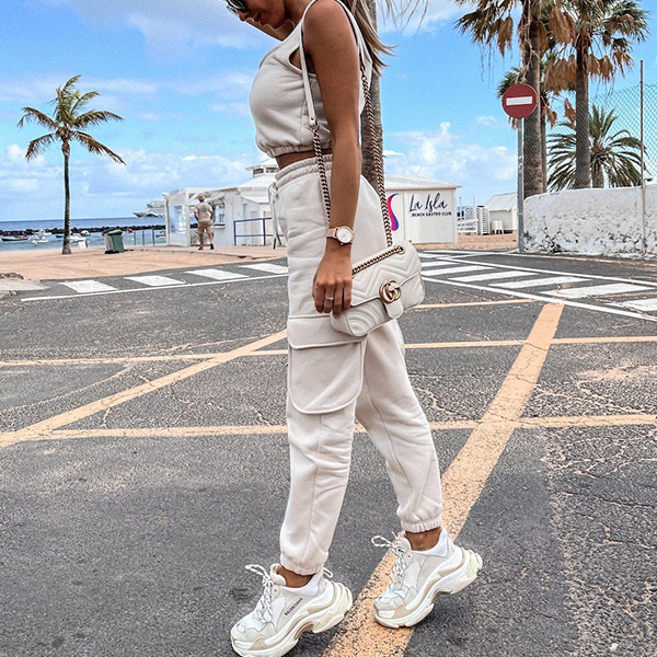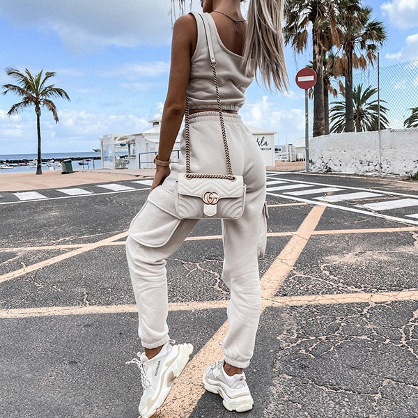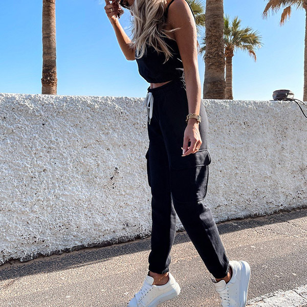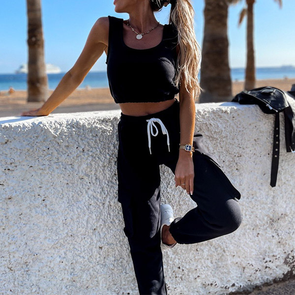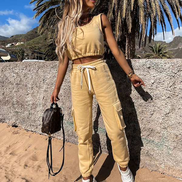 You can have a cool and comfortable daily style when you dress yourself up with this two-piece set. Solid color style,including a sleeveless round neck crop top and a high waist side-pocket pants,this two-piece set not only can give you a comfortable day,but also can exude your style and personality. So why not take interest in them?