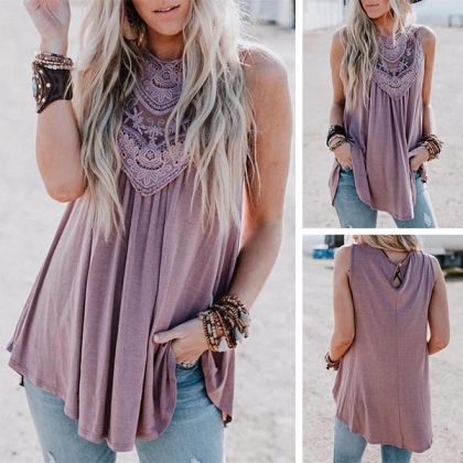 Embrace the summer days with a relaxed piece such as this top! It comes with a solid color,with sleeveless,round neck and a loose silhouette,this piece definitely can offer you an utmost comfort. Moreover,the lace spliced design will enhance its charm. So why not enrich your wardrobe with this little piece?
