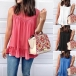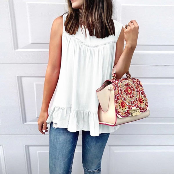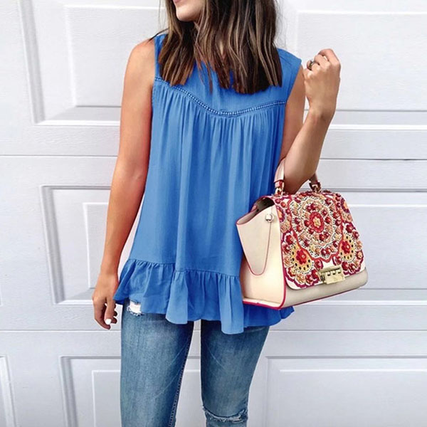 As for a simple,cozy and relaxed daily style,this top can be a wise choice. Solid color style,with sleeveless,round neck,ruffle hem and a loose silhouette,this piece knows how to give you a comfortable day while it maintains your style. Matching with a tight pants would be a good idea.