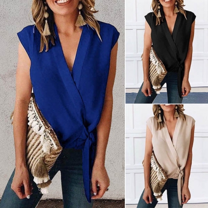 This wonderful top comes with a solid color,with sleeveless and v-neck design,which can make you look stylish yet feminine. Moreover,the lace-up design at the hem part will further enhance its charm. We suggest you matching with a tight pants to have a fashionable look.