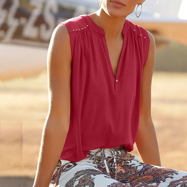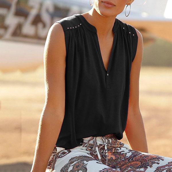 Fashion Solid Color Sleeveless V-neck Rivets Top
