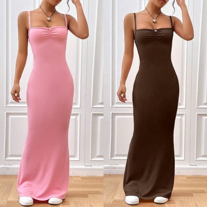 Denna maxiklänning har en fyrkantig halsringning, vilket ger en modern och sofistikerad touch till den övergripande designen. Remmarna i cami-stil ger en feminin och delikat look, medan maxilängden skapar en långsträckt och graciös siluett. Hoppas du gillar det.