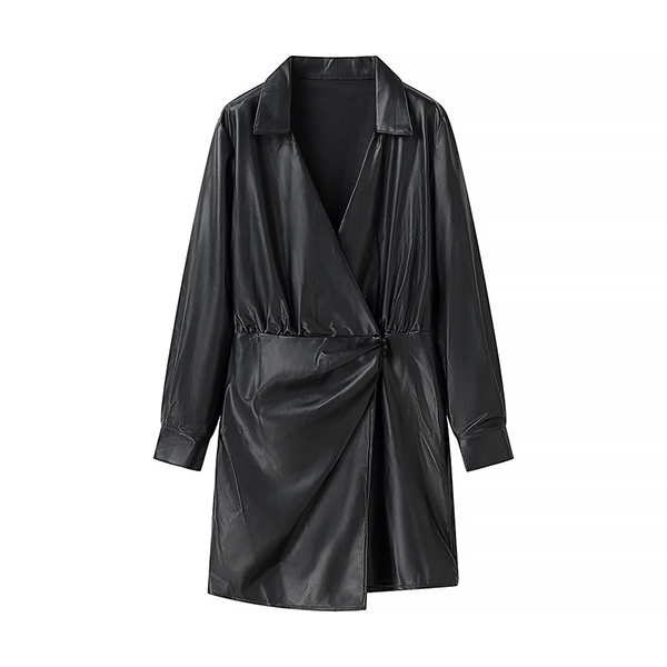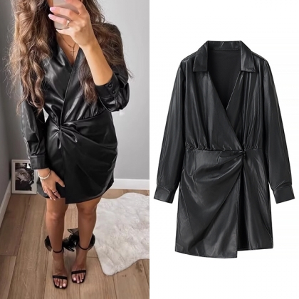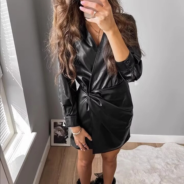 Trendig PU-klänning med ståkrage och V-ringning – enfärgad långärmad med sidovävda detaljer