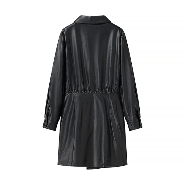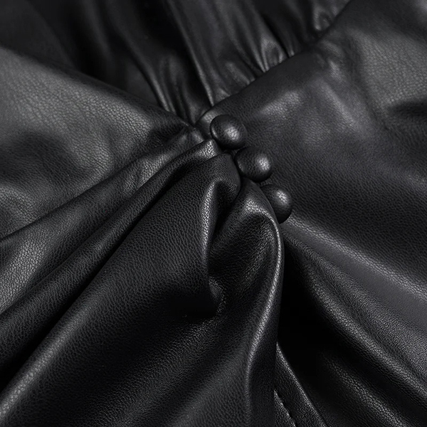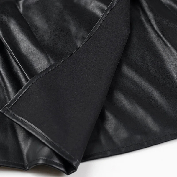 Denna tuffa klänning i exklusiv läderlook är tillverkad i högkvalitativt syntetmaterial som ger samma rockiga känsla som äkta skinn – utan att tumma på djuretiken. Med sina slående designdetaljer sticker den ut i mängden: den unika hybridkragen kombinerar en självsäker ståkrage med en smickrande V-ringning, och de figurnära sömmarna framhäver midjan perfekt. Rynkdetaljer vid ärmarna och den lekfulla kjollängden ger en rebellisk touch. Lättmatchad och slitstark är den idealisk för kvällsfester, trendiga events eller chic vardagslook. Sätt tonen med en klänning som garanterat drar blickarna till dig och höjer din stil till nästa nivå.