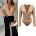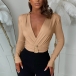 Denna eleganta bodysuit kombinerar en djup V-ringning med stilrena metallspännen och bekväma långärmar i ett stretchigt, andningsbart material som följer kroppens konturer utan att tappa formen. Det exklusiva tyget känns mjukt mot huden och ger en slimmad silhuett som håller hela dagen och kvällen. Matcha med högmidjade kjolar och stilettklackar för en tidlös, elegant look, eller bär den med vida byxor och kraftiga accessoarer för en modern, edgy stil. Med sin perfekta passform och lyxiga detaljer sticker den ut bland andra bodysuits och blir snabbt favoritvalet för både vardag och fest.