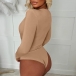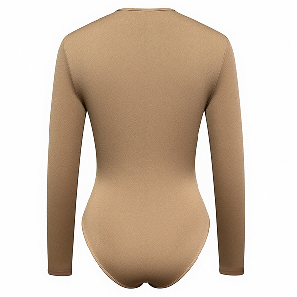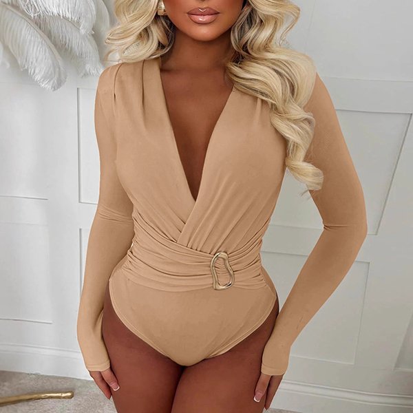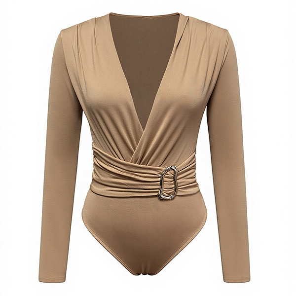 Bodysuit långärmad med V-ringning i enfärgad, stilren design med metallspänne