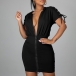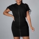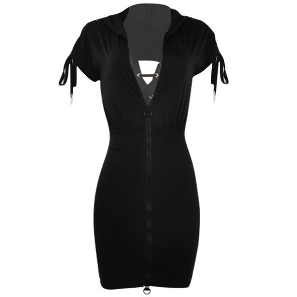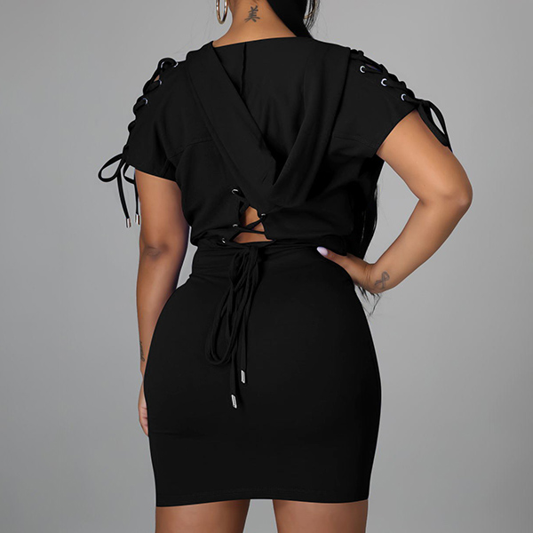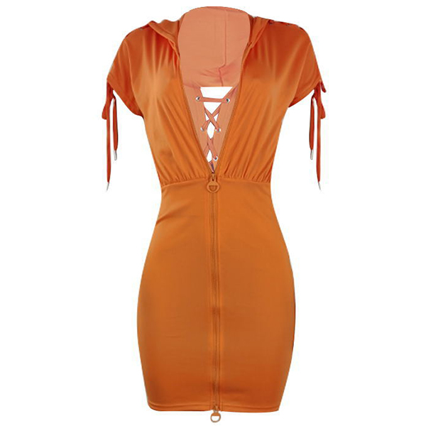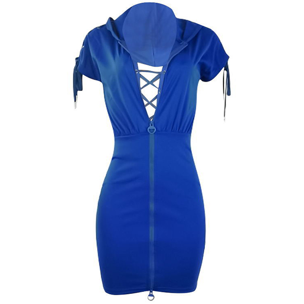 Fashion Solid Color Zipper Back Lace-up Short Sleeve Bodycon Hoodie Dress