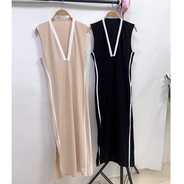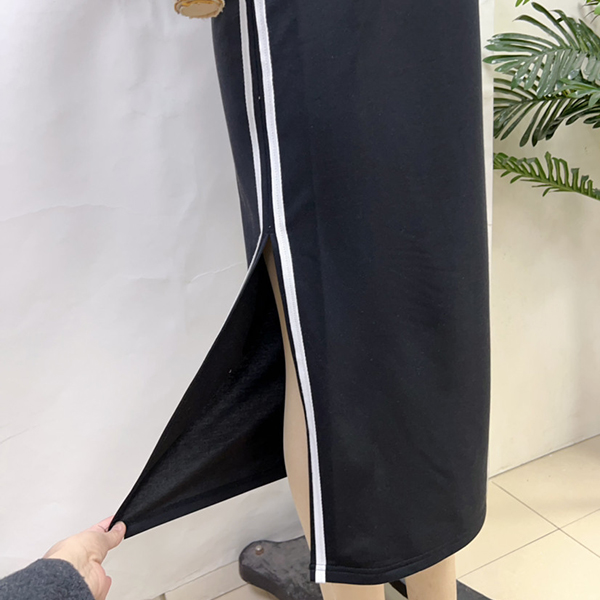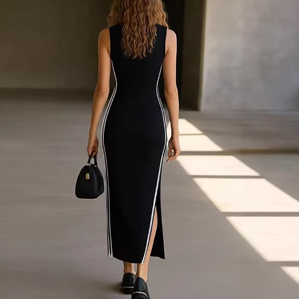Omdefiniera avslappnad elegans med denna iögonfallande klänning som perfekt kombinerar atletisk inspiration med feminin lockelse. Ikoniska vita vertikala ränder längs båda sidorna skapar en omedelbar bantande effekt som visuellt förlänger siluetten och framhäver dina kurvor. Designad med en vågad slits i sidan erbjuder denna midiklänning obegränsad rörelsefrihet och en touch av ben i varje steg. Tillverkad av ett bekvämt, stretchigt tyg (troligen ribbstickat) omsluter den kroppen utan att kännas begränsande. Det är det perfekta plagget att slänga på sig och ta med till en avslappnad brunch, en sommarsemester eller en trendig streetlook.