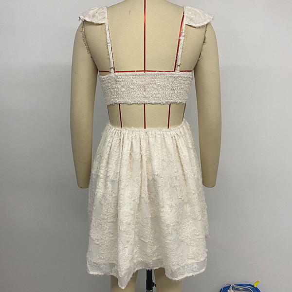 Det här är en chic och sofistikerad klänning som utstrålar elegans och lockelse. Den har en fyrkantig hals, volangdetaljer på axeln och en rygglös design. Jacquardtyget ger klänningen textur och visuellt intresse, vilket skapar en lyxig och högkvalitativ look som säkerligen kommer att väcka uppmärksamhet. Kombinera den här klänningen med klackar och statementsmycken för en glamorös och elegant look, eller välj sandaler med remmar och en clutch för en mer avslappnad och chic ensemble.