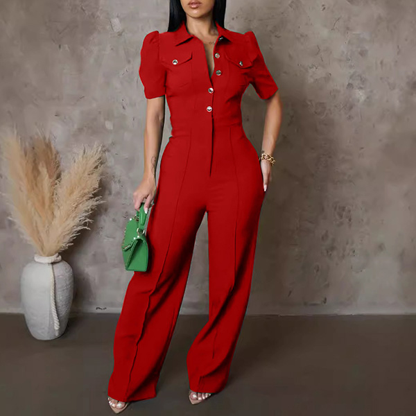Jumpsuit med kort ärm och vid ben med knapp framtill och modest krage
