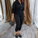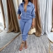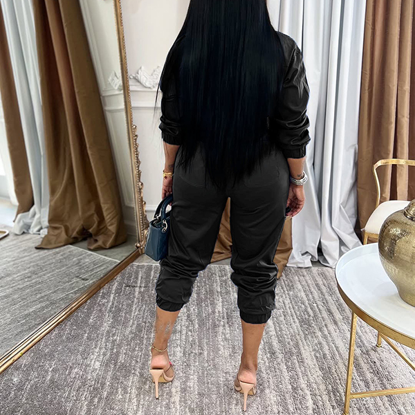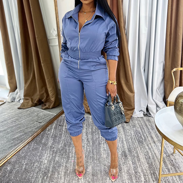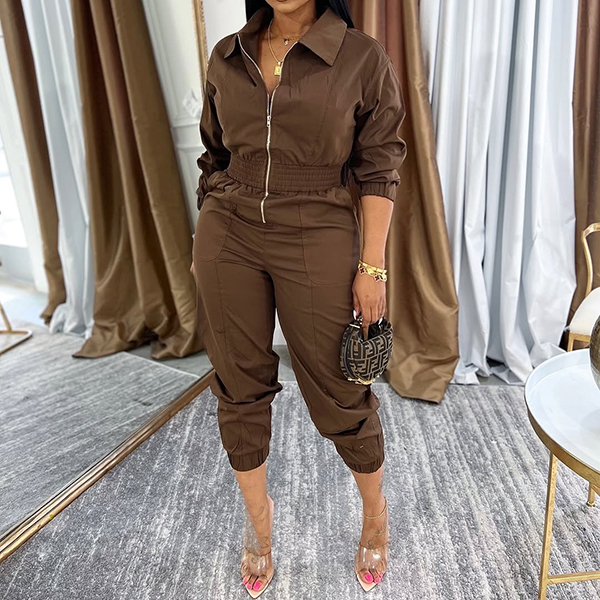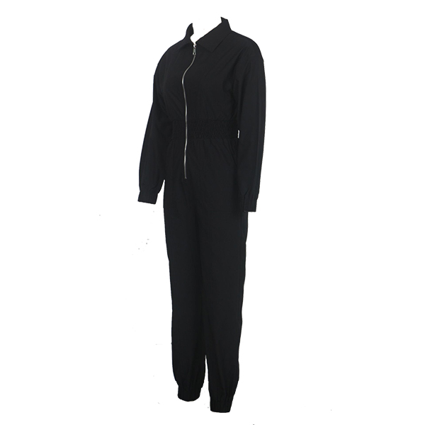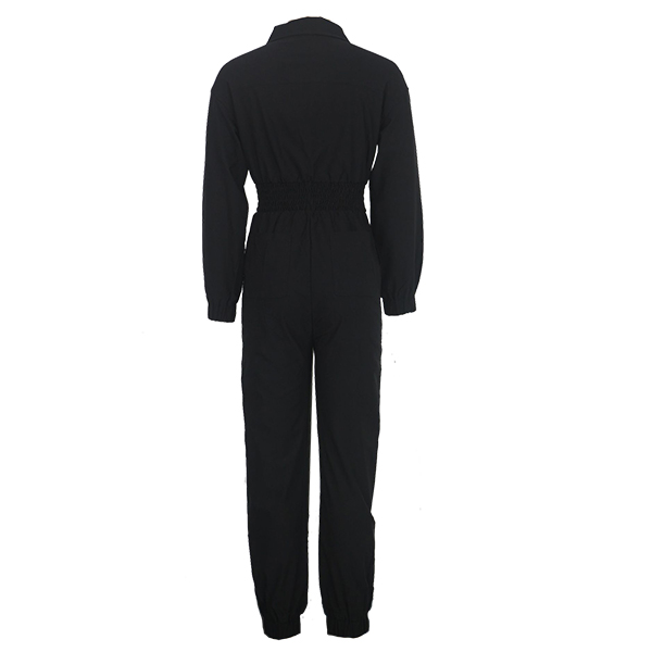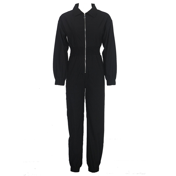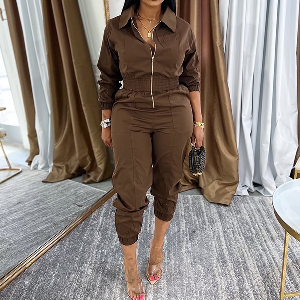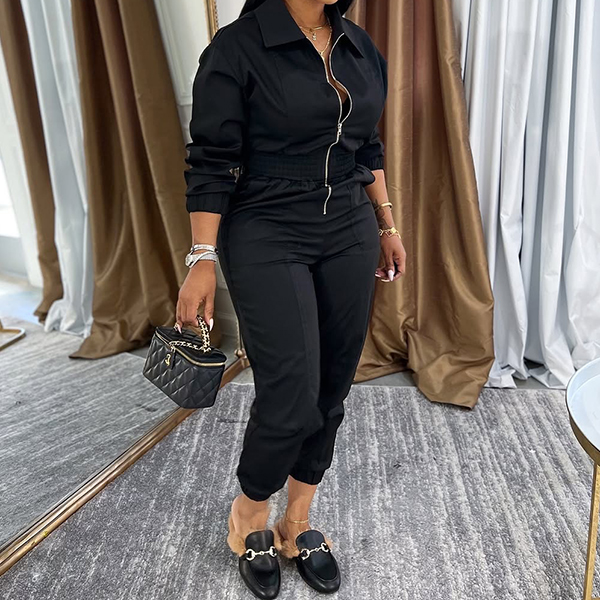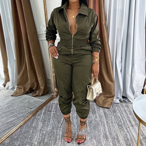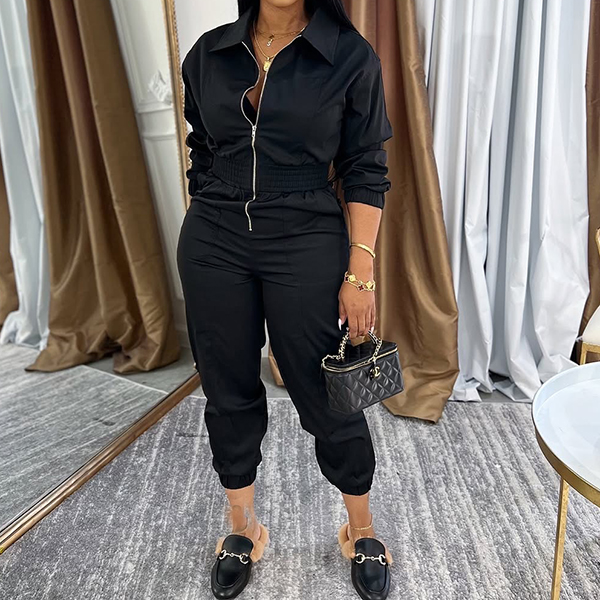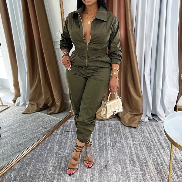 Jumpsuit med ståkrage och dragkedja, trendig V-ringning, långärmad med resår i midjan