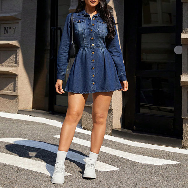 Upptäck en tidlös denimklänning som skiljer sig från mängden med sin premiumtvättade finish och noggrant utvalda ekologiska bomull – en riktig vintageinspirerad statement-piece. Ståkragen ger omedelbart struktur och en modern känsla, medan knappslån framtill skapar en klassisk skjortklänningseffekt med oändliga stylingmöjligheter. Den justerbara midjan framhäver naturligt timglassilhuetten och erbjuder både komfort och en smickrande passform för alla kroppstyper. Med förstärkta sömmar, ton-i-ton-knappar och en lätt utställd kjoldel blir den här denimklänningen din nya favorit för helgbruncher, avslappnade kontorsdagar eller trendiga shoppingturer – ett hållbart basplagg som kombinerar enkelhet med sofistikerad stil.