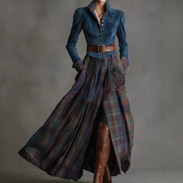Fashion Stand Collar Long Sleeve Front Button Plaid Spliced Front Slit Maxi Dress