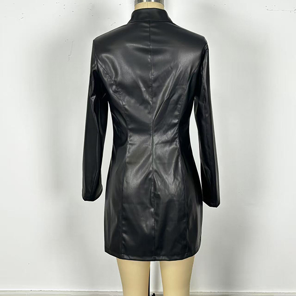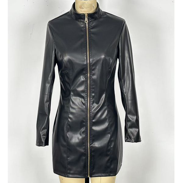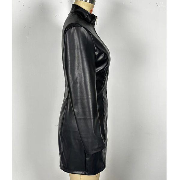 PU-bodyconklänning i konstläder med ståkrage, långärmad och frontdragkedja