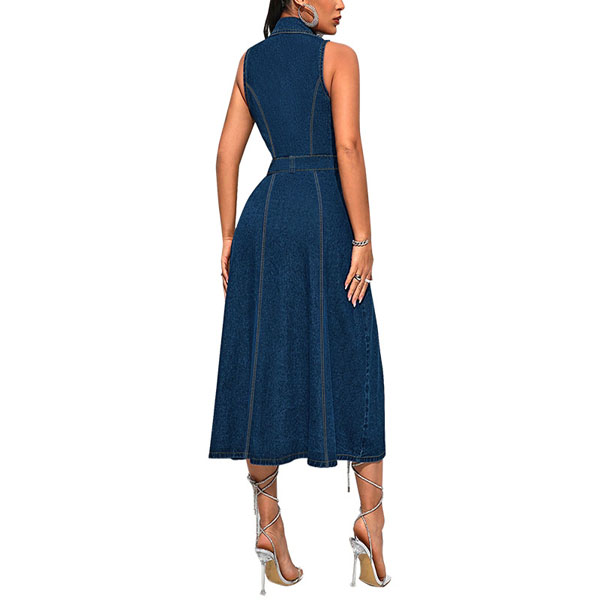 Detta är en trendig och mångsidig denimklänning som utstrålar modern charm och avslappnad sofistikering. Den har en ärmlös siluett och knäppning framtill med en elegant slitsdetalj, och erbjuder en avslappnad men ändå moderiktig look som enkelt kan kläs upp eller ner. Hoppas du gillar den.