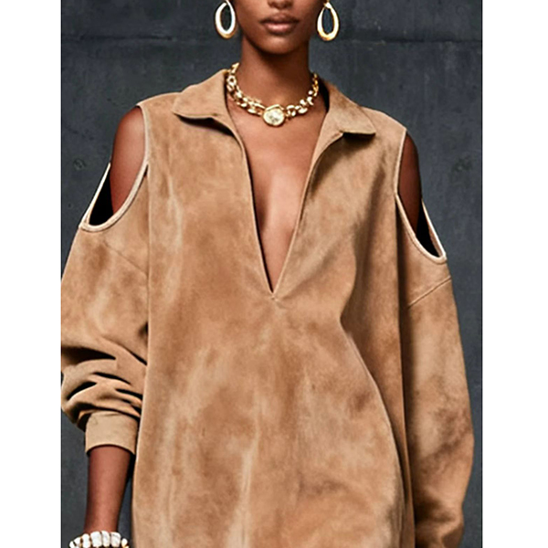 Trendig miniklänning med ståkrage, V-ringad öppen axel och långa ärmar