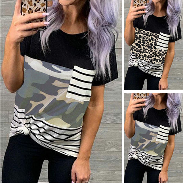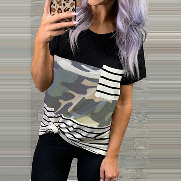 Fashion Stripe Camouflage Spliced Short Sleeve Round Neck T-shirt