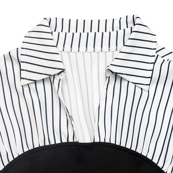 Den smarta designen skapar en illusion av sofistikerade lager-på-lager-effekter i ett enda, strömlinjeformat plagg. Det randiga mönstret tillför en klassisk nautisk charm med tidlös attraktionskraft, medan den imiterade tvådelade konstruktionen ger intryck av matchande separata plagg – med bekvämligheten hos ett. Ståkragen bidrar med strukturerad elegans och modern förfining. Perfekt för hektiska livsstilar som kräver enkelhet och stil.